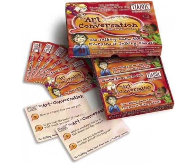 The 104 cards provide 200 conversation topics, carefully created and tested to promote and stimulate communication, plus 4 blank cards for children to personalise. TAOC® is fun for everyone and is also a highly effective therapeutic and educational resource for families, therapists, counselors, teachers, speech pathologists, language teachers, coaches, church leaders and more.
