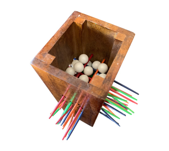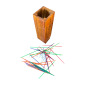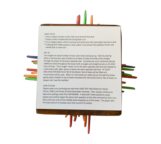 Plunktika is the latest game from Open Spaces and it can be used with any Totika card deck. The top two levels of holes on all tower sides must have sticks straight across Plunktika to the opposite side hole. On all other levels, put at least one sticks at an angle to the other side of the tower, meaning to the hole that is left, right, above or below.