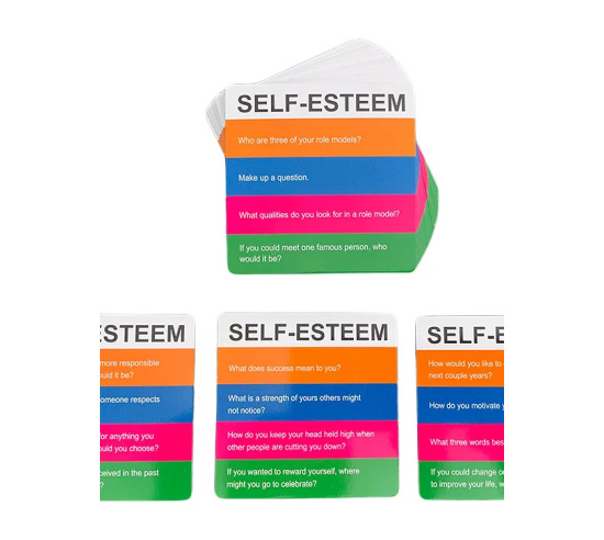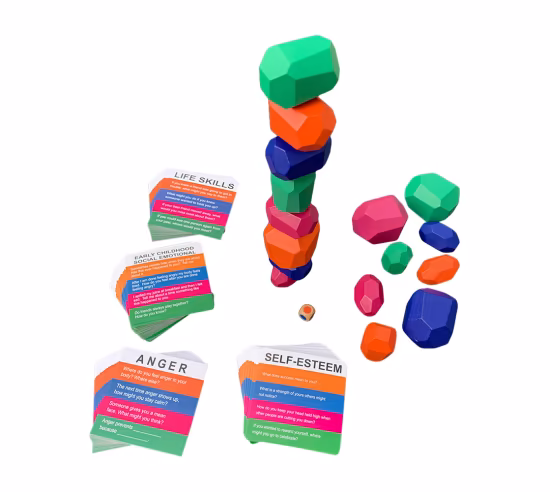 Four card decks, each with over 150 questions, including Self Esteem, Life Skills and Anger for ages 8 and up plus the Early Childhood Social Emotional deck for ages 4-7. The drawstring game bag holds all four decks, the 16 Kohatu stones plus a game dice. Choking hazard not appropriate for under age 3.