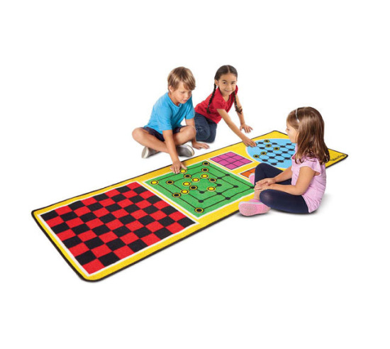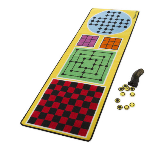 Skid-proof game rug incorporates four classic games and 36 double-sided wooden play pieces for your playroom. Tic-Tac-Toe, Checkers, Nine-Men's Morris and Solitaire printed on a colorful 78.5"L x 26.5"W rug. Game directions included.