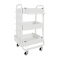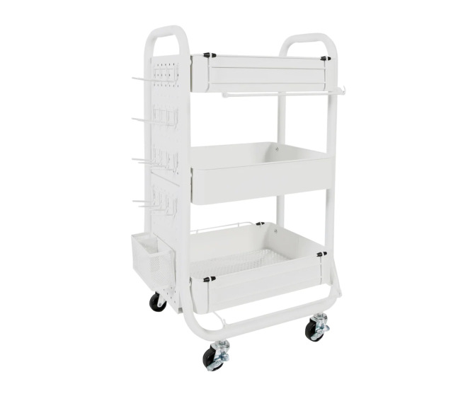 Keep your art supplies organized and easy to access with this roll-away storage cart. Includes three trays and multiple storage hooks. Sturdy metal construction and locking casters. Measures 31.5" tall, 17.9" W, and 14.8" Long
