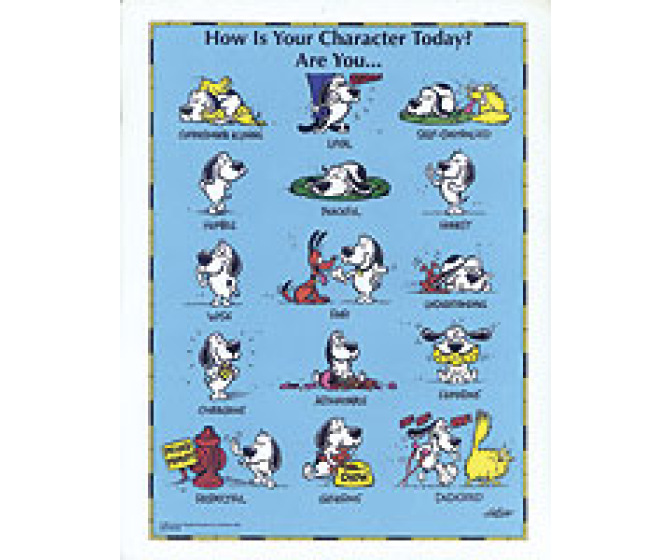 How is your character today? Colorful poster with dog illustrations and examples of character such as fair, loyal, and honest. Spark conversations with this laminated 18"x24" poster.