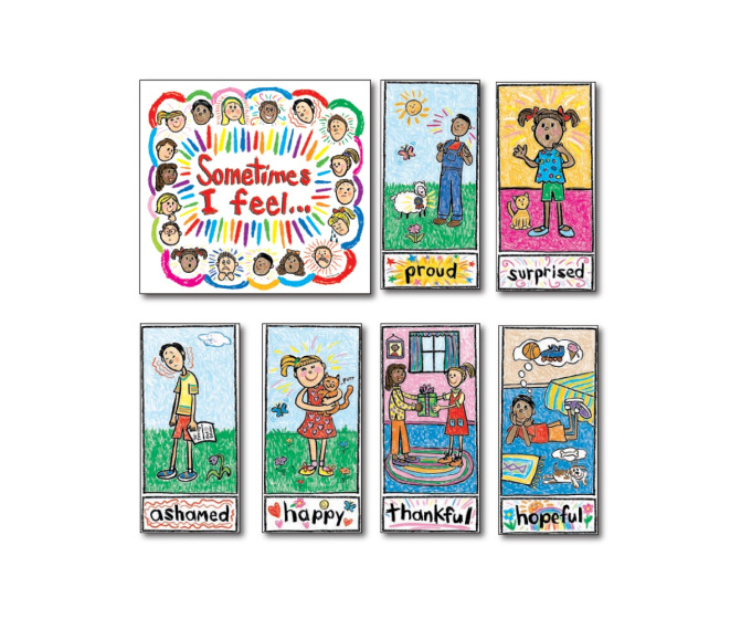 The Kid-Drawn Emotions Poster Set includes 16 cut-apart emotion cards (7.5” x 16” each), 16 emotion word cards, and a "Sometimes I Feel" header. Features emotions such as shy, jealous, scared, thankful, angry, happy, and more. Great for bulletin boards.