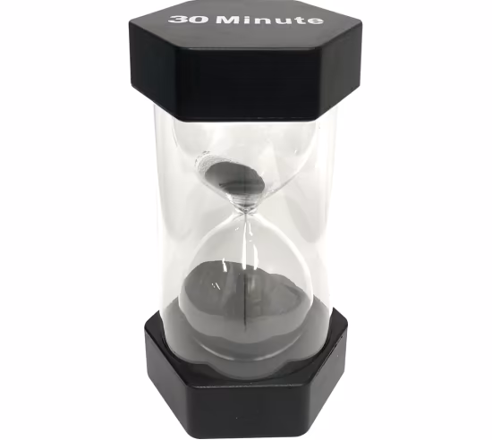 The 30 Minute Large Sand Timer is a durable plastic timer with colored sand. Race to see how much can be accomplished before time runs out. Great for games, timed tests, and time management. Timer measures 3¼" x 6⅜".