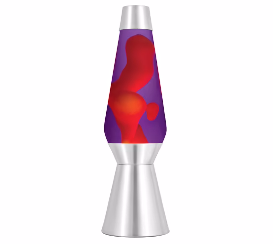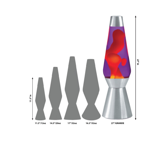 Watch the mesmerizing motion of different sized blobs as they collide, split apart and ooze their way up and around the glass globe of this super-sized LAVA® lamp. A hand-spun base and cap make this lamp truly unique. Make a statement in any room and enjoy the colorful, relaxing motion of the largest LAVA® lamp. Yellow wax / purple liquid / silver base & cap provides soft, relaxing light. Plugs into any standard North American electrical outlet.
