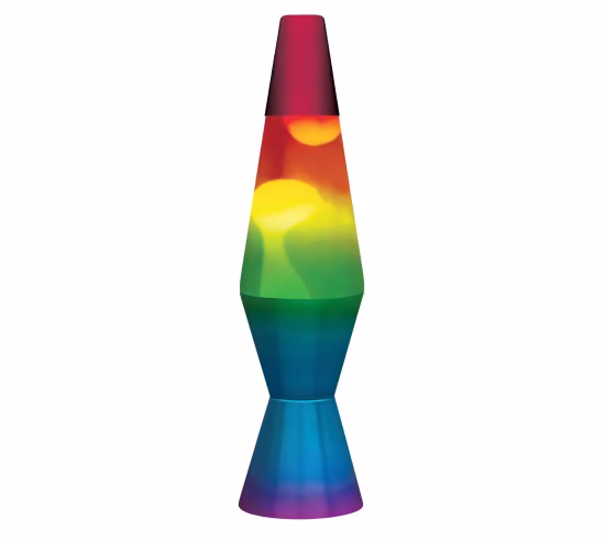 This LAVA® lamp spreads color and cheer! The hand painted rainbow base and cap match perfectly to the rainbow of the multi-colored glass globe as the white wax passes through the moving lava, absorbing the different colors and changing tone. This beautiful rainbow lamp will bring color and a relaxed, happy vibe to any room. Chill with the peaceful motion of this colorful version of the timeless LAVA® lamp. Plugs into any standard North American electrical outlet.