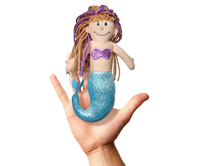 A mermaid finger puppet for storytelling and play. Attach the puppet with the loop on the back, approximately 7.5" tall.