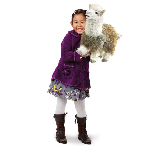 Prized for their lustrous, warm fleece, Alpacas grow their long woolly coats to withstand the crisp mountain air. The Folkmanis ALPACA Puppet is as soft and gentle as a Peruvian flower. Its sweet face and ultra-soft micro fiber body plush make this Alpaca puppet irresistibly cuddly. 19" in length.