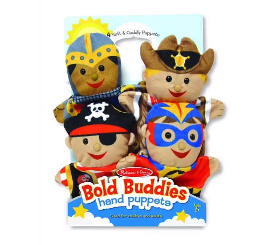 Stuffed plush heads will fit child to adult hands. Pirate, knight, cowboy and superhero puppets help teach boldness and courage in a fun way.