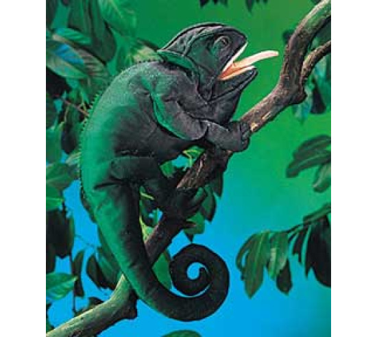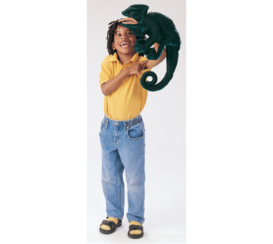 All size hands fit inside this chameleon and the tongue can be extended too! Useful for play and storytelling and the ability to change colors makes this lizard one we can all identify with. Who doesn't want to camouflage themselves every once in awhile? Dimensions 18 x 6 x 11 inches