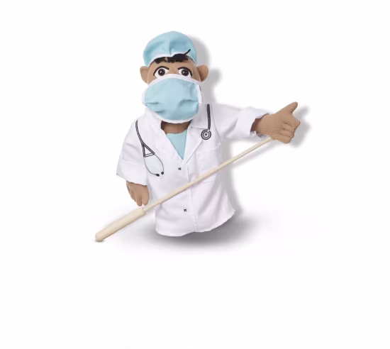 A doctor puppet for your play room. Features a working mouth, removable clothing, and removable rod. Like the rest of the clothes, medical mask may be used or taken off. Rod removes very easily for hand operation.