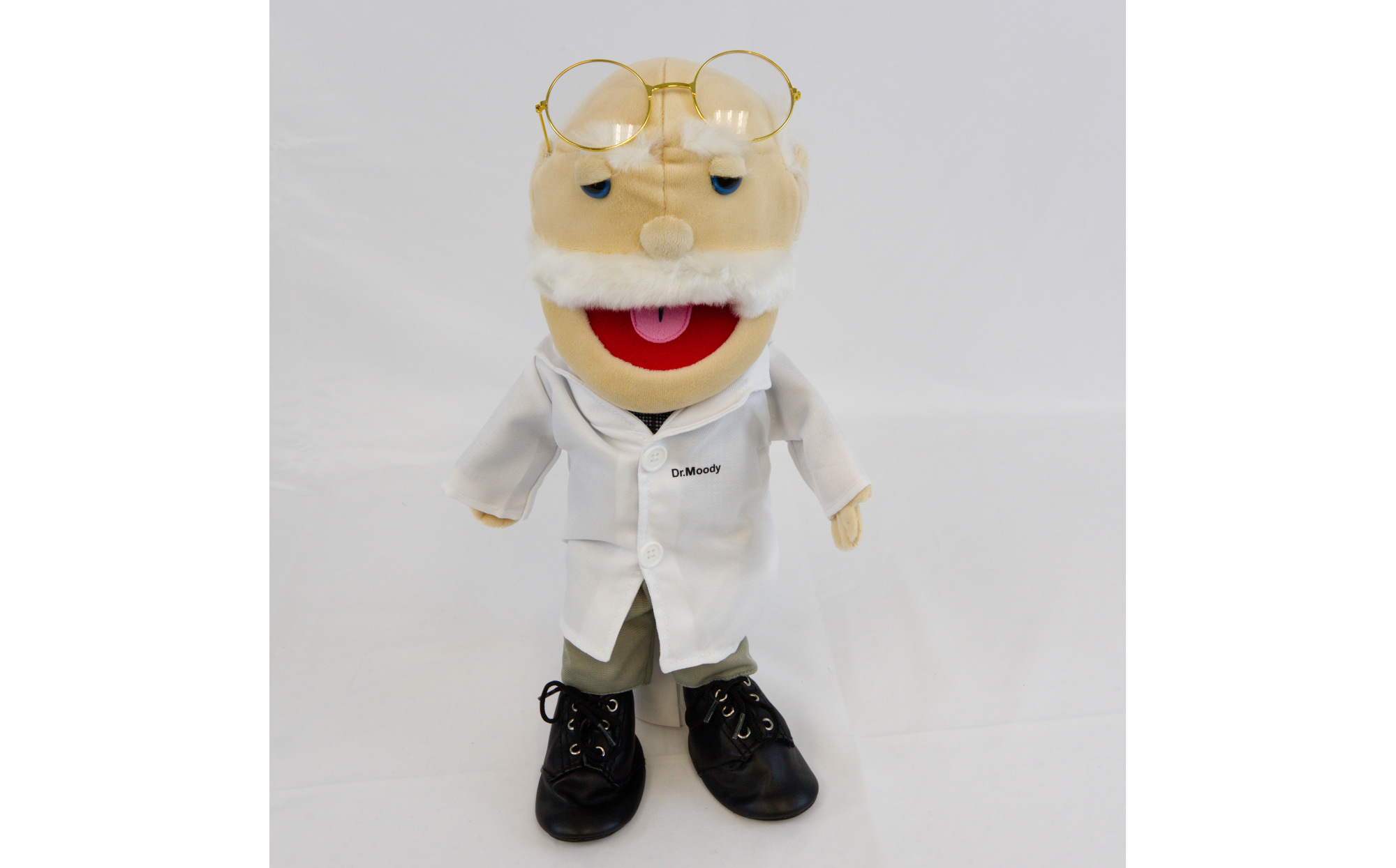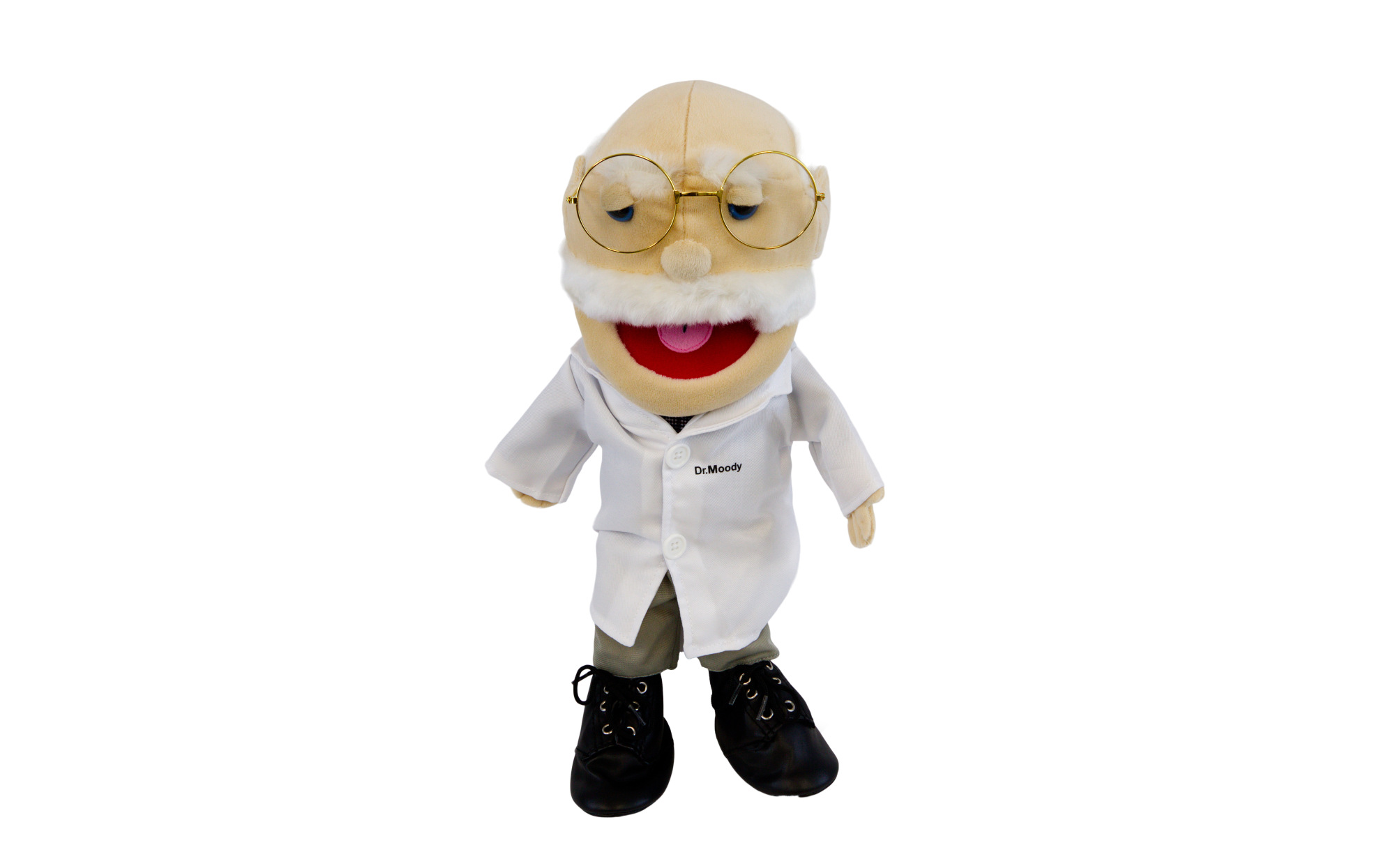 Dr. Moody wears a removable lab coat with his name printed on it. Beneath, he sports a checkered shirt and gray slacks. His realistic glasses, balding hairline, and mustache add a charming touch to this silly character.