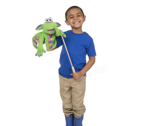 Plush dragon hand puppet for your play room. Lots of detail including a forked tongue and glittery accents. Dragon's mouth opens and closes.