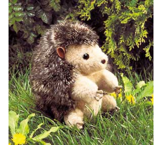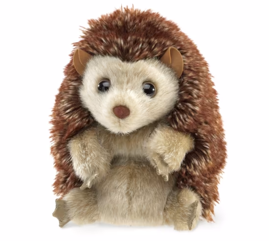 Cute hedgehog hand puppet rolls into a ball and has super soft fur and beady eyes. Fun to play with and useful for storytelling, it's ability to protect itself by turning into a ball is wonderfully empowering to children who are learning how to feel safe. Head and paws can be animated. 7.7" tall.