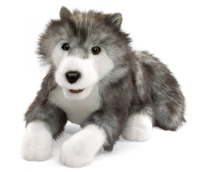 A timber wolf puppet with piercing eyes and full body. Whiskers, plush, and soft, superior detailing. Mouth is animatable. 18" in length