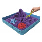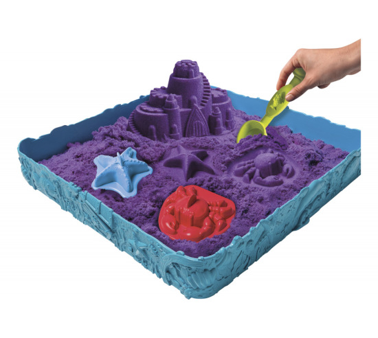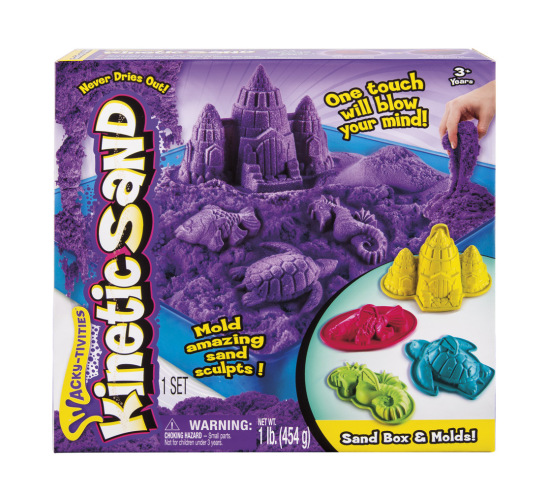 The kinetic sand box comes with a plastic tray, four molds and one pound of kinetic sand. Easy to clean and fun to play with! Kinetic sand is moldable and sticks to itself. Includes one set. Colors are assorted in blue, green, and purple.
