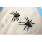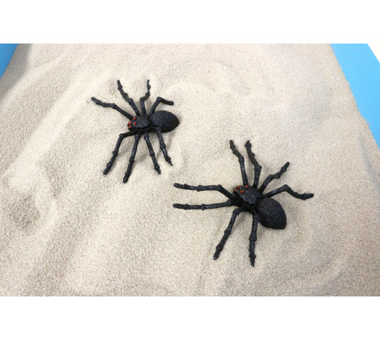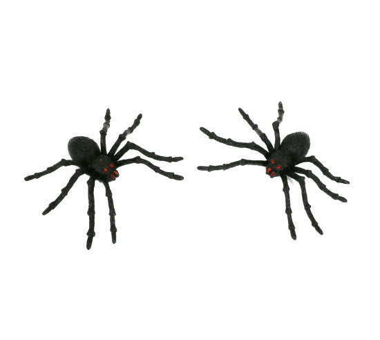 Set of two large ugly spiders have red eyes. Made of a rubberized plastic. Each spider is approximately 5 1/2" wide.
