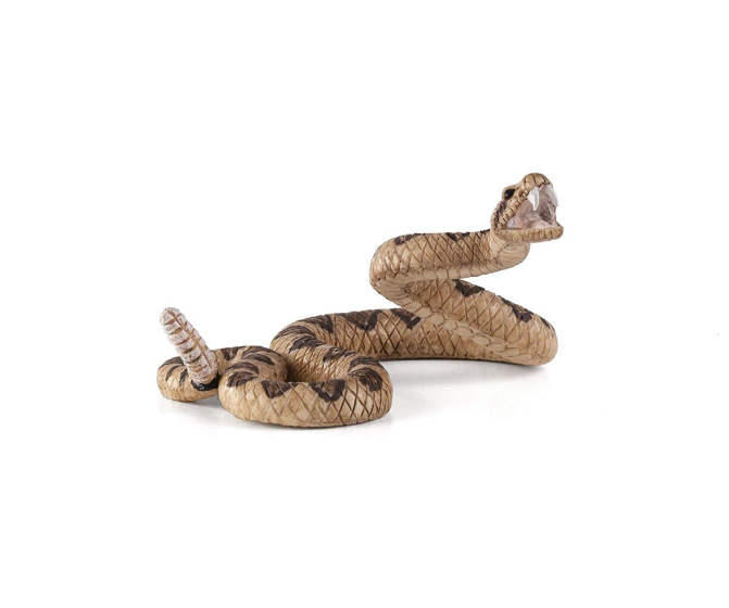 This miniature rattlesnake features exposed fangs and poised, fearsome body language. A predatory figure for sand tray, 2.5 x 1.5 x 1 inch (W x D x H).