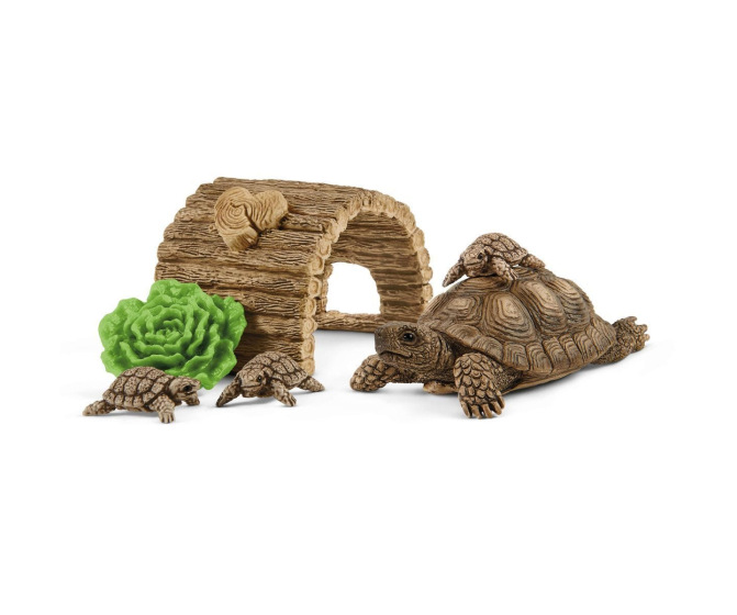 Six piece set includes mama tortoise, her 3 babies, a luscious leaf of lettuce, and their comfortable log home.