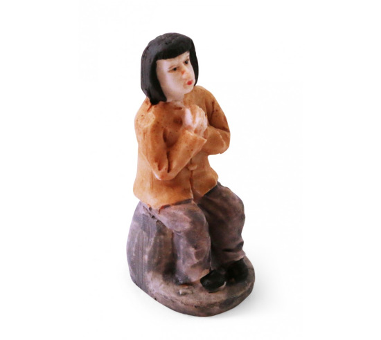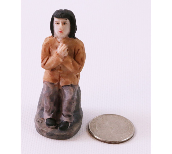 An ambiguously gendered figure sitting with hands over heart. Figure appears anxious and expecting of something. Hand painted, resin 2.5" tall; may be slight variations due to detailed painting by hand.