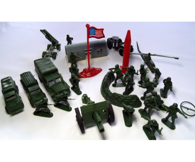 Get ready for war in your sand tray. Green army men, a bunker, lightweight vehicles included in this army set. 30+ figures