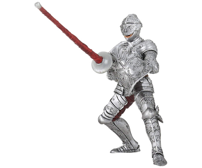 Protected by head to foot armor, a lance, and shield, this knight is on the defense. 3.5" tall, helmet, shield and lance move but are not removable.