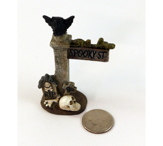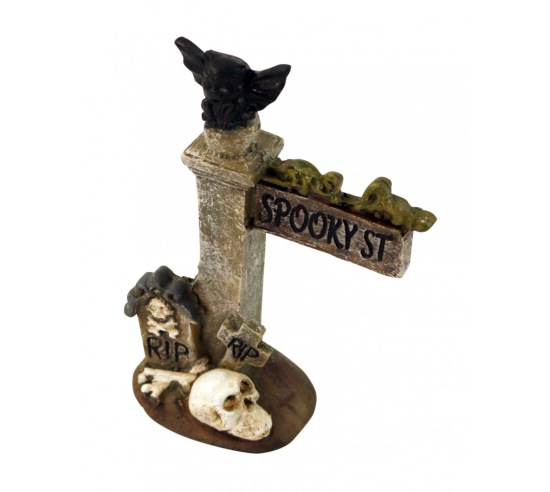 Resin sign is a grim warning of what lies ahead. 3.25" tall scary sign is accented with a skull and tombstones.