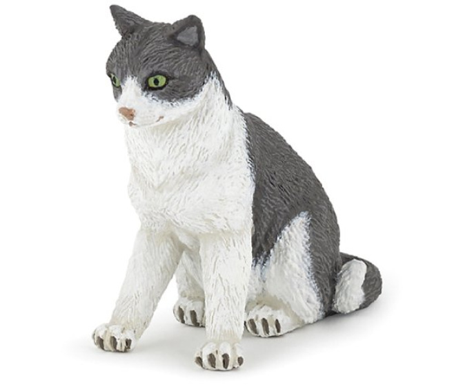 A gray and white cat sand tray miniature. Cat measures 0.91 x 1.97 x 2.76 inches