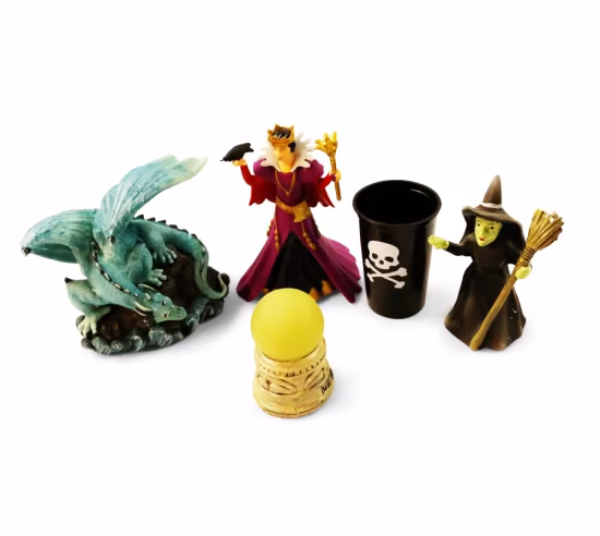 Evil, magical and a little mysterious is our new Dark Magic theme kit. Set includes a cup of poison, blue dragon perched on a rock, an Evil Queen, the Wicked Witch and her crystal ball. Young clients especially will gravitate towards these figures and the crystal ball that really lights up (battery included). Sizes range from 2" tall to 3.5" long