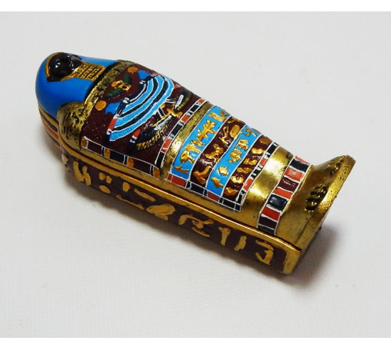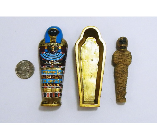 A two piece sarcophagus with removable mummy inside. Stunning quality. Measures 4" x 1 1/2" x 1 1/4".