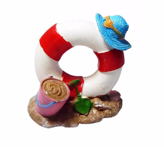A nice-sized life preserver that won't get lost on your sand tray shelves. Resin mini is adorned with a hat, sand bucket and shovel. Measures 2 3/4" in height.
