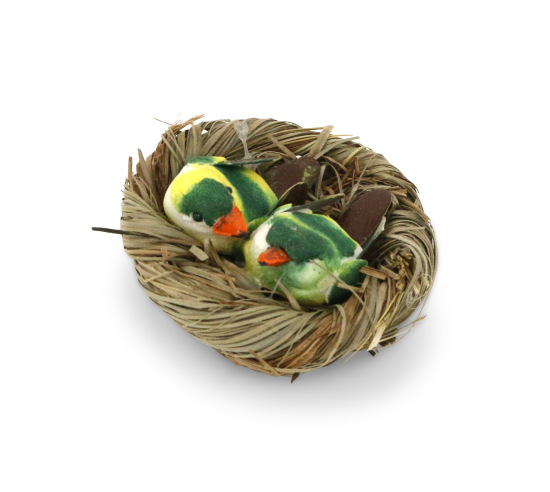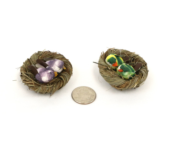 I really like this nest with the cute little birds. It's on the larger side for miniatures, about the size of my palm, rather than a tiny nest. The kids will love it though because they aren't as bothered as I am by the varying proportions of the minis in my sandtray. Definitely recommend. It's a more fragile piece that is very realistic, with the natural texture of the nest and softness of the birds. Love it!