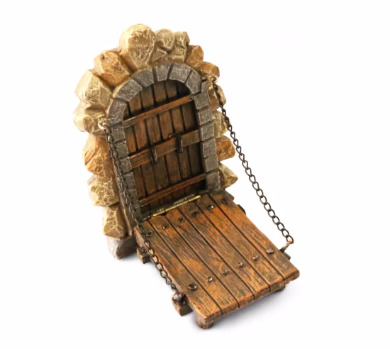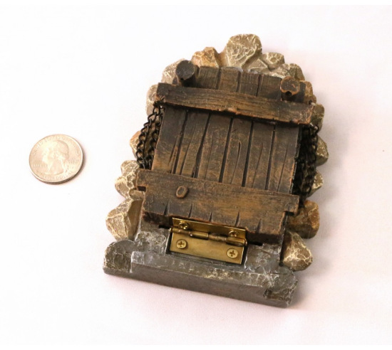 This drawbridge has quickly become a new favorite of ours. With a hinged door and metal chains, all the little knights in training in your playroom will love it too. 5" tall, made of resin.