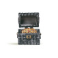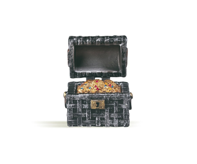 A plastic hinged treasure chest with gold and treasures fixed inside. 3.2 x 3.9 x 2 inches
