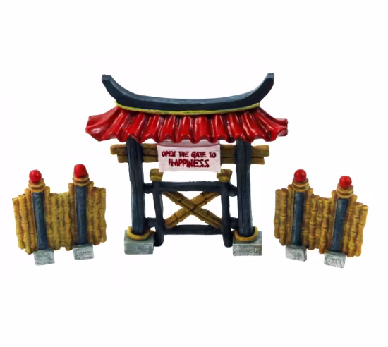 This traditional Japanese Torii gate includes a three piece set. Middle gate states "Open the Gate of Happiness". A symbolic miniature set representing the transition from worldly to holy. Largest piece measures 2 1/4" x 1/2" x 3 1/2".