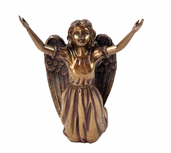 This bronze colored angel is kneeling with arms raised in praise and head titled high. Joyous figurine measures 4 3/4" in height.