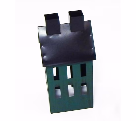 A green tin house with black roof. Hollow interior encourages clients to place objects inside. Measures 2 3/4" x 2 1/2" x 6".