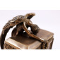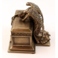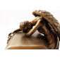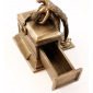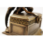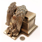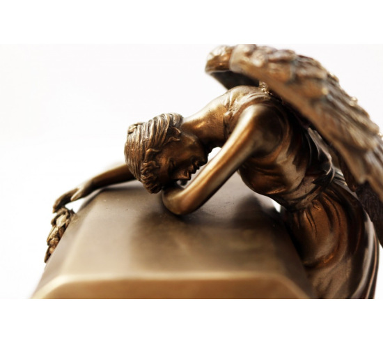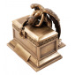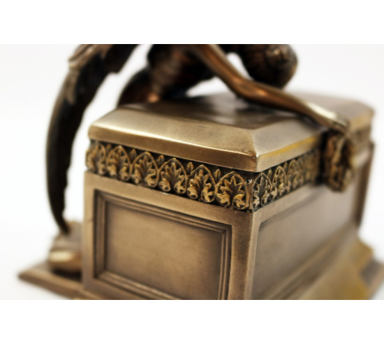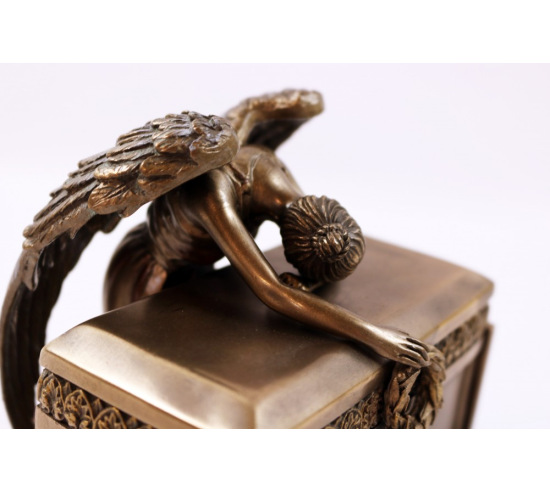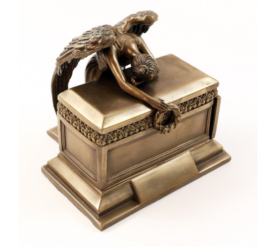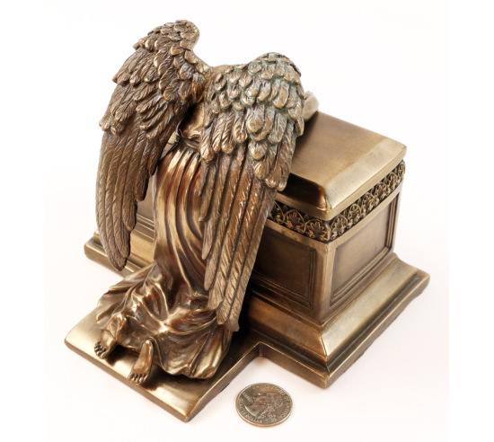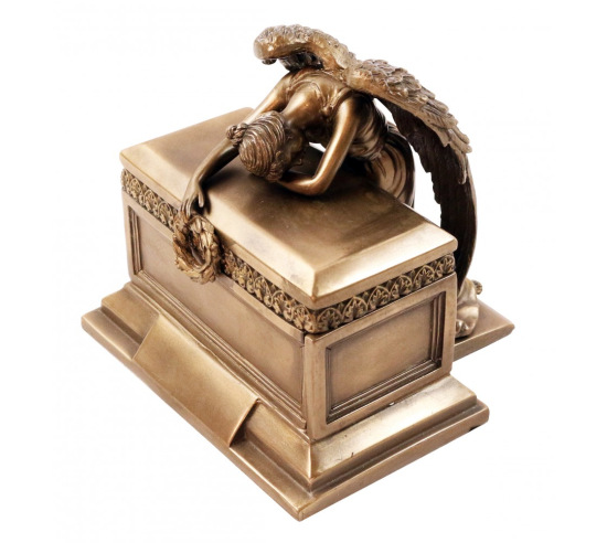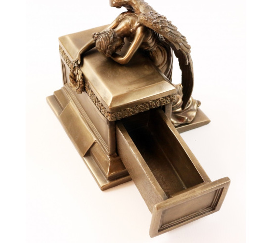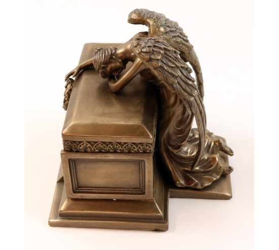 This statute speaks volumes. Sturdy, solid mausoleum in bronze finish adorned with a mourning angel opens for other minis to be placed inside. This figurine captures the sadness of death without the scariness of departure. Nice sized measures 6" x 5 3/4" x 5 1/2".