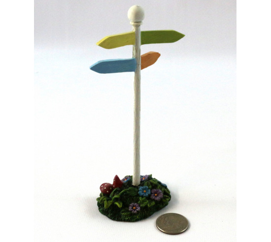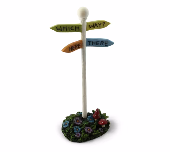 Teen and adult clients will relate with this sign with states "Here" "There" and "Which" "Way?". Which path will they take? Decorative flower bed accent. Resin 6" tall.