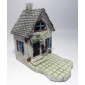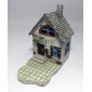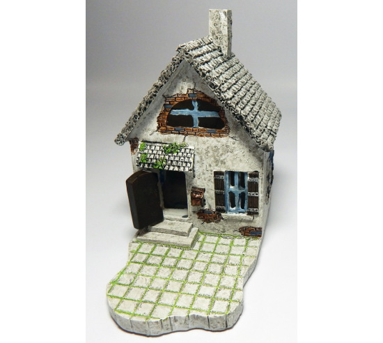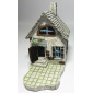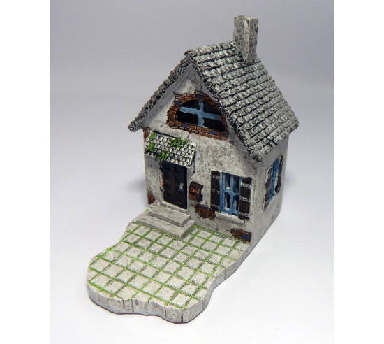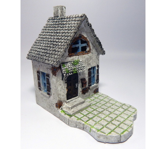 A resin stone house with a patio for sand tray therapy. Realistic house has a mailbox on the front and a hinged door that opens. House is hollow for miniatures to fit inside. House appears blighted with moss growing, exposed brick, and rugged windows. A neat addition for your sand tray selection. House including patio is 5" in length, 3 1/2" wide, and 7" high.