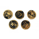 Set of four plastic gold-colored coins for sand tray or play. May represent money, wealth, desires, power. Each coin measures 1.25" diameter.