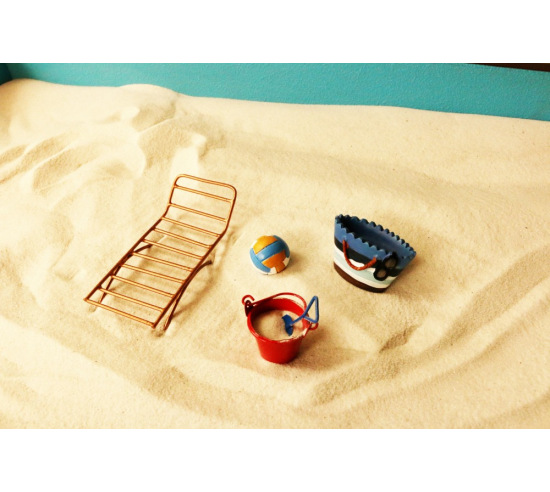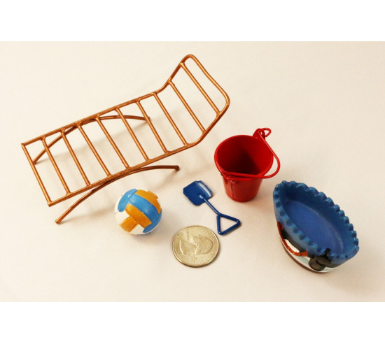 All that's left for a relaxing day at the beach is the sand! Kit includes a bronze lounge chair, sand bucket and shovel, beach bag, and volleyball. Assorted sizes from 1.5" to 4.25".