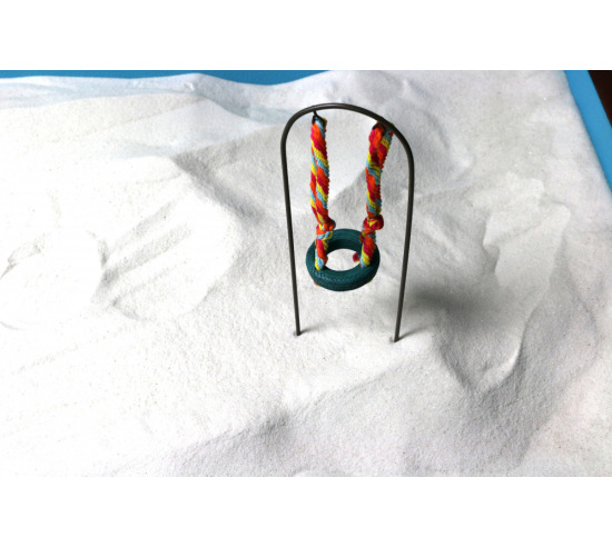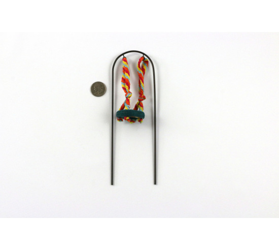 This tire swing will remind your clients of warm summer days. Wire hanger with rainbow ropes and turquoise swing measures 8" tall.