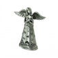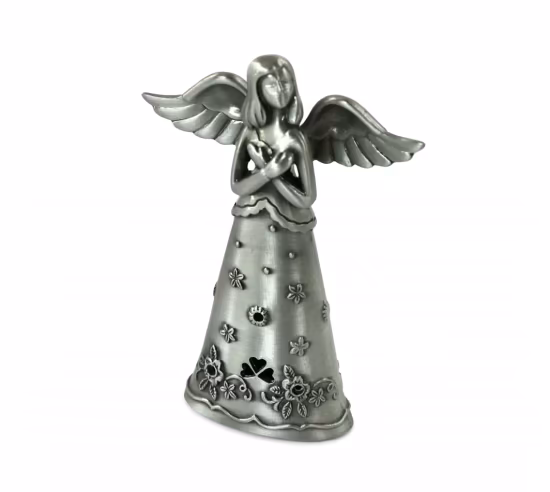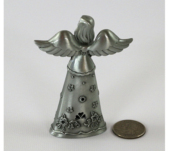 Intricate metal angel with arms crossed over her heart. 3.5" tall.