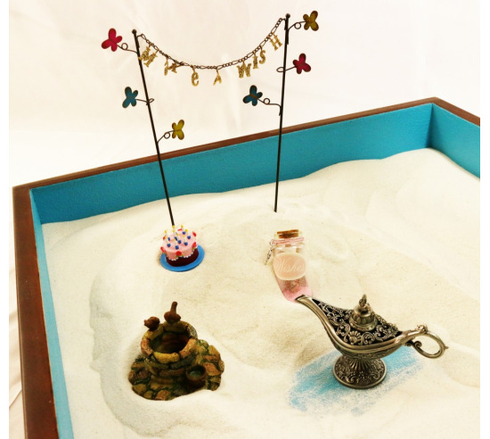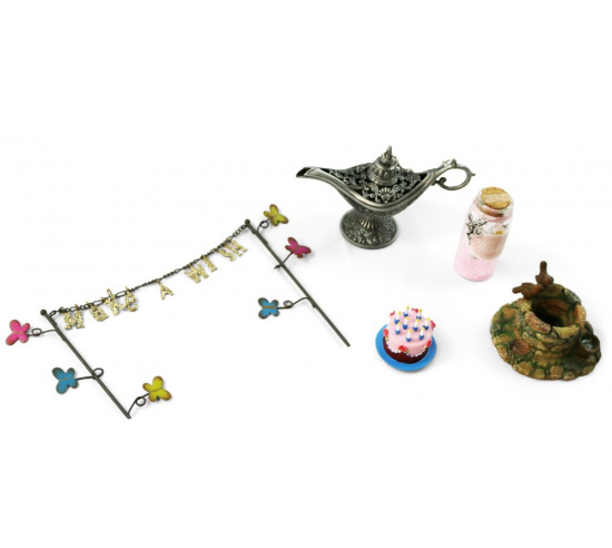 Wishes and desires are so important to your clients that we've created this exclusive kit for all sorts of wish-making. Includes: impressive magic lamp (4.5" long), darling birthday cake with candles (1.5" tall), a wish jar with scroll (2.5" tall, color may vary), a wishing well graced with birds (1.5" tall) and a "Make a Wish" banner that will look dazzling in the sand.
