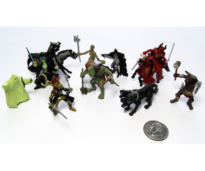 From Papo, enjoy twelve tiny mythical creatures. Each figure is approximately 1 1/2" tall. Set includes a ghost, ogre, minotaur, cerberus, pirate skeleton, skeleton with weapon, faceless horseman, two knights, and three horses. Lots of detail and all weapons are removable!