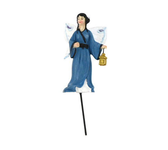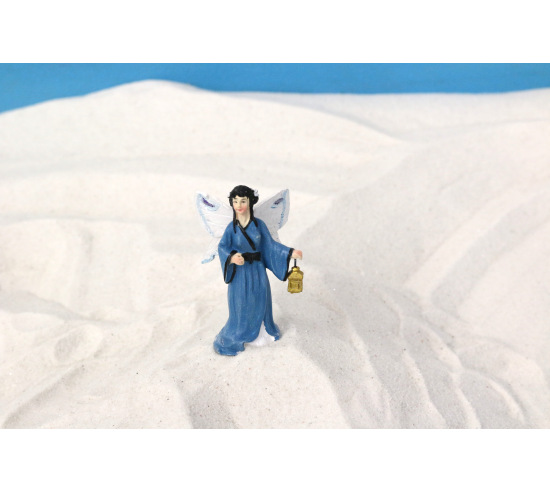 Small fairy with shimmery wings and holding a lantern for sand tray. 2 5/8" tall, excluding the pick.