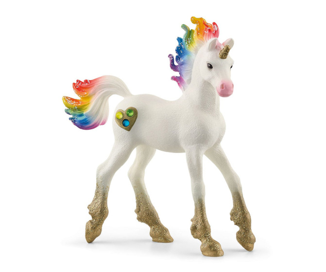 Twinkle and shine, sparkle and gleam - the Rainbow Love Unicorn Foal is glimmering with magic and enchantment! This adorable rainbow unicorn has a mane and tail streaked with radiant color. A metallic golden horn dazzles with brilliance in the morning sun. Each of the unicorn's legs is shimmering in glittery gold. Approx 3 3/4" tall.