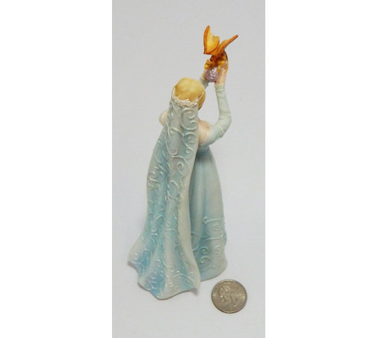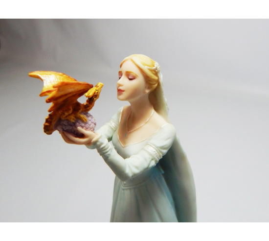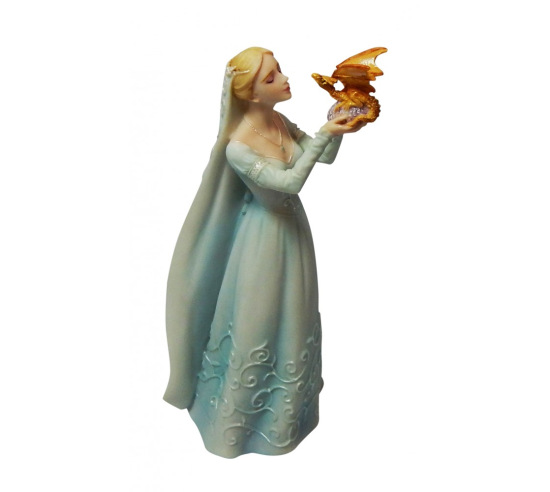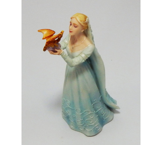 Stunning precision and care have gone into this figurine for sand tray. A princess in blue dress and veil lovingly looks upon a dragon hatchling. A unique figure symbolizing unwarranted love. Measures 8" diameter at base and 6 1/4" in height.