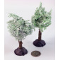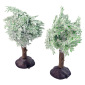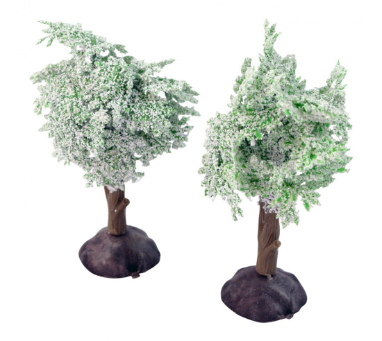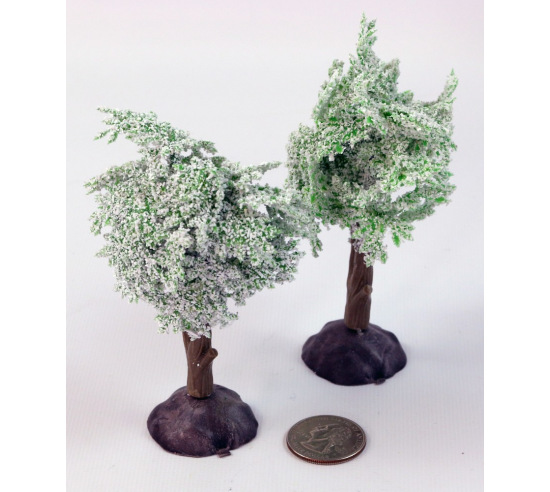 Two green-leafed trees covered in snow. Each tree 4" tall.